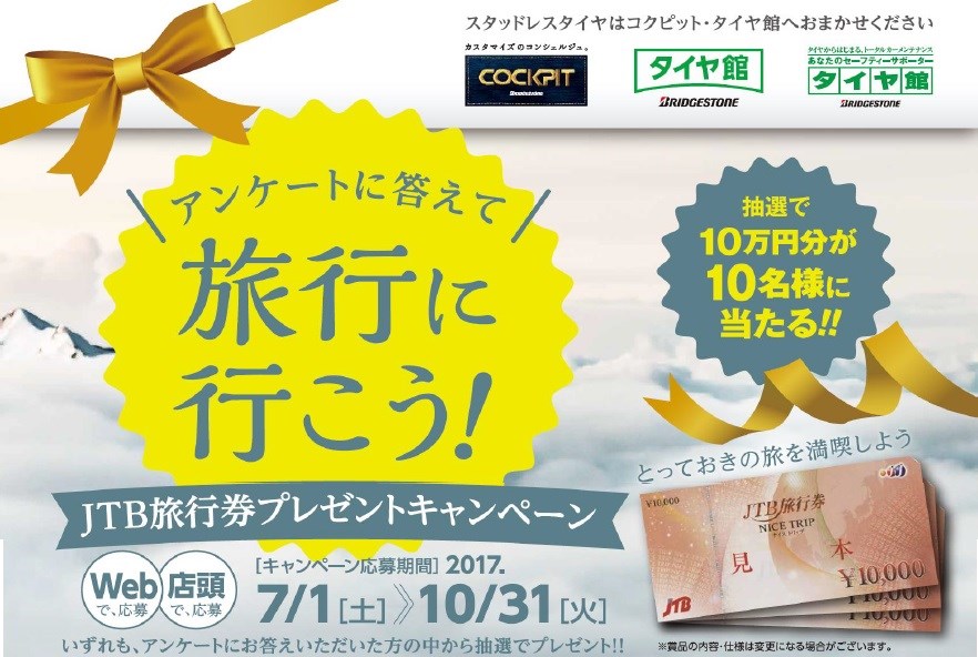 2017年7月6日 ツイート アンケートに答えて、とっておきの旅を満喫しませんか? JTB旅行券10万円分が抽選で10名様に当たるアンケートを実施中です! キャンペーン期間は、7月1日(土曜)から10月31日(火曜)まで! 当店も実施しておりますので、是非ご来店くださいm(__)m Prev Next