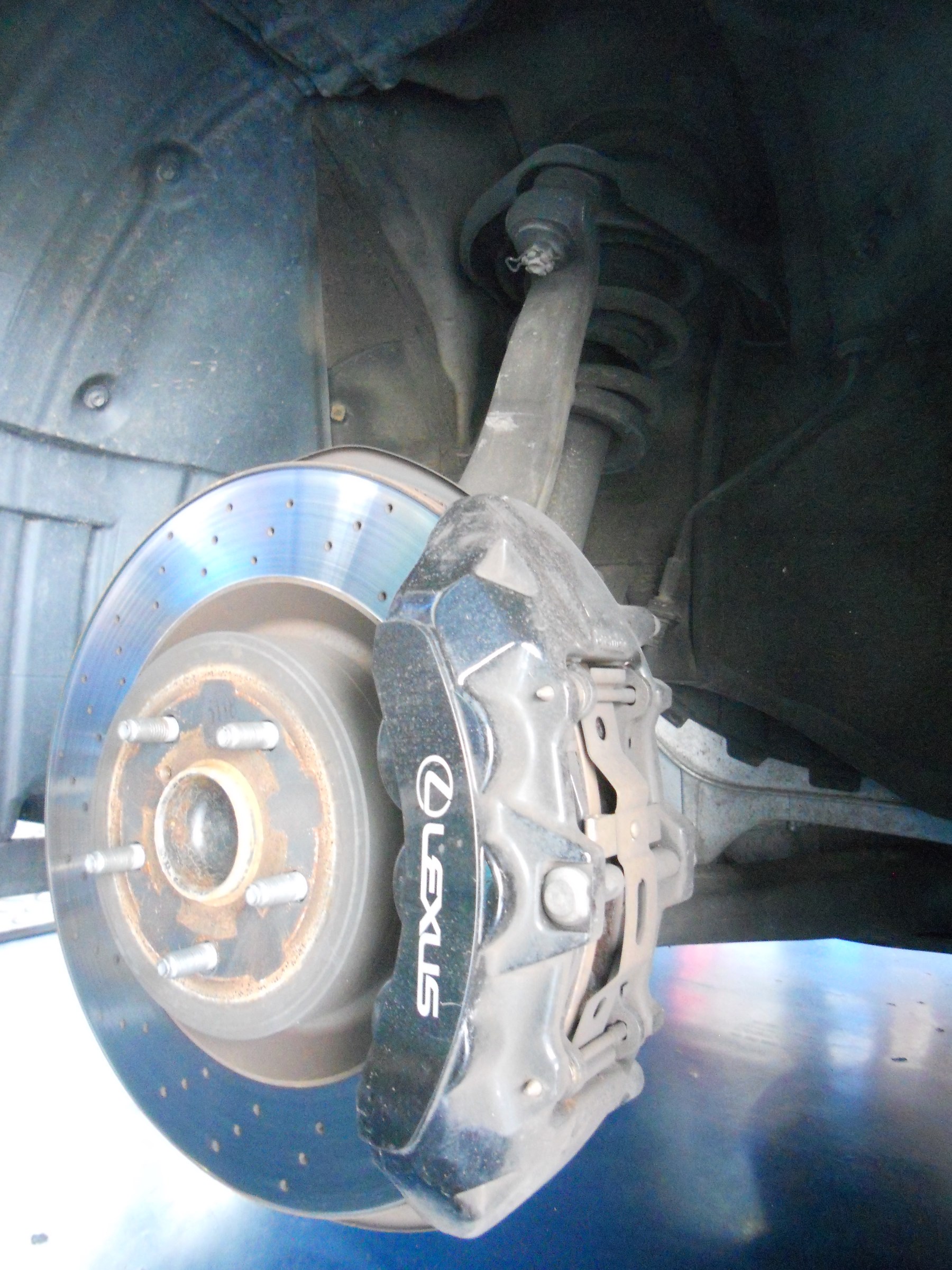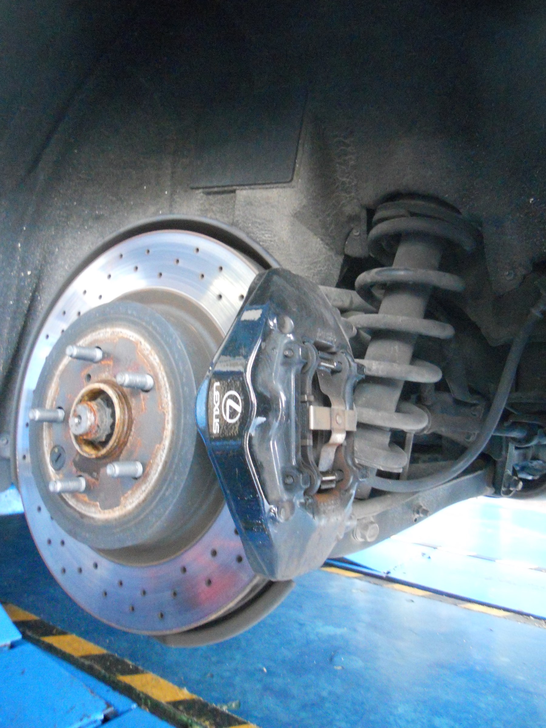 純正キャリパーが大きいので、傷つけないように慎重に作業します。