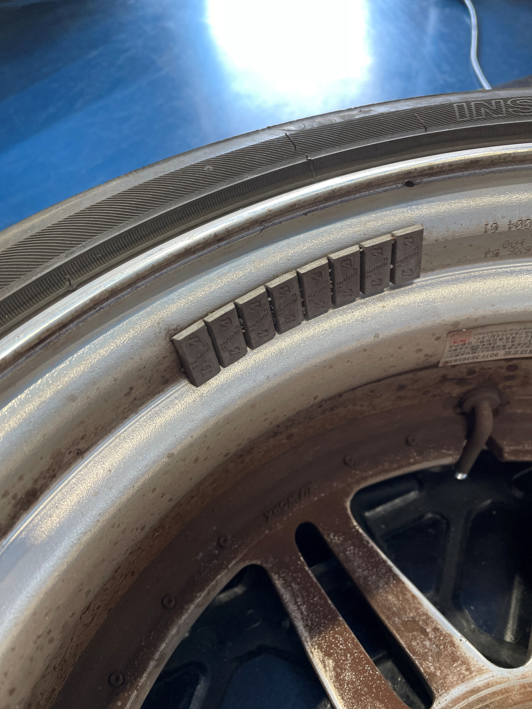 アルミホイールの場合は、この様に貼り付けタイプのバランスウェイトを使用します。