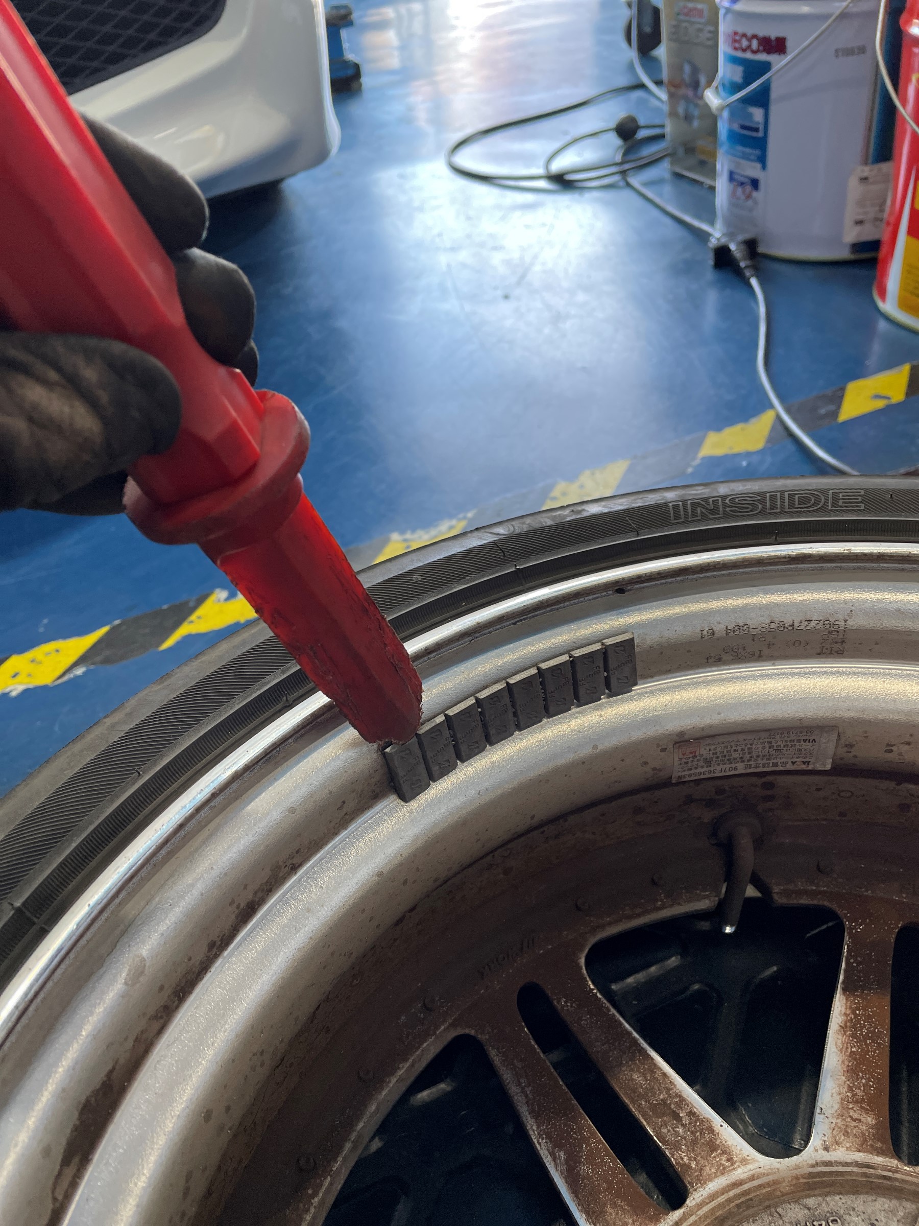 ホイールに傷が付かない様にプラスチックのヘラでウェイトを剥がしていきます。