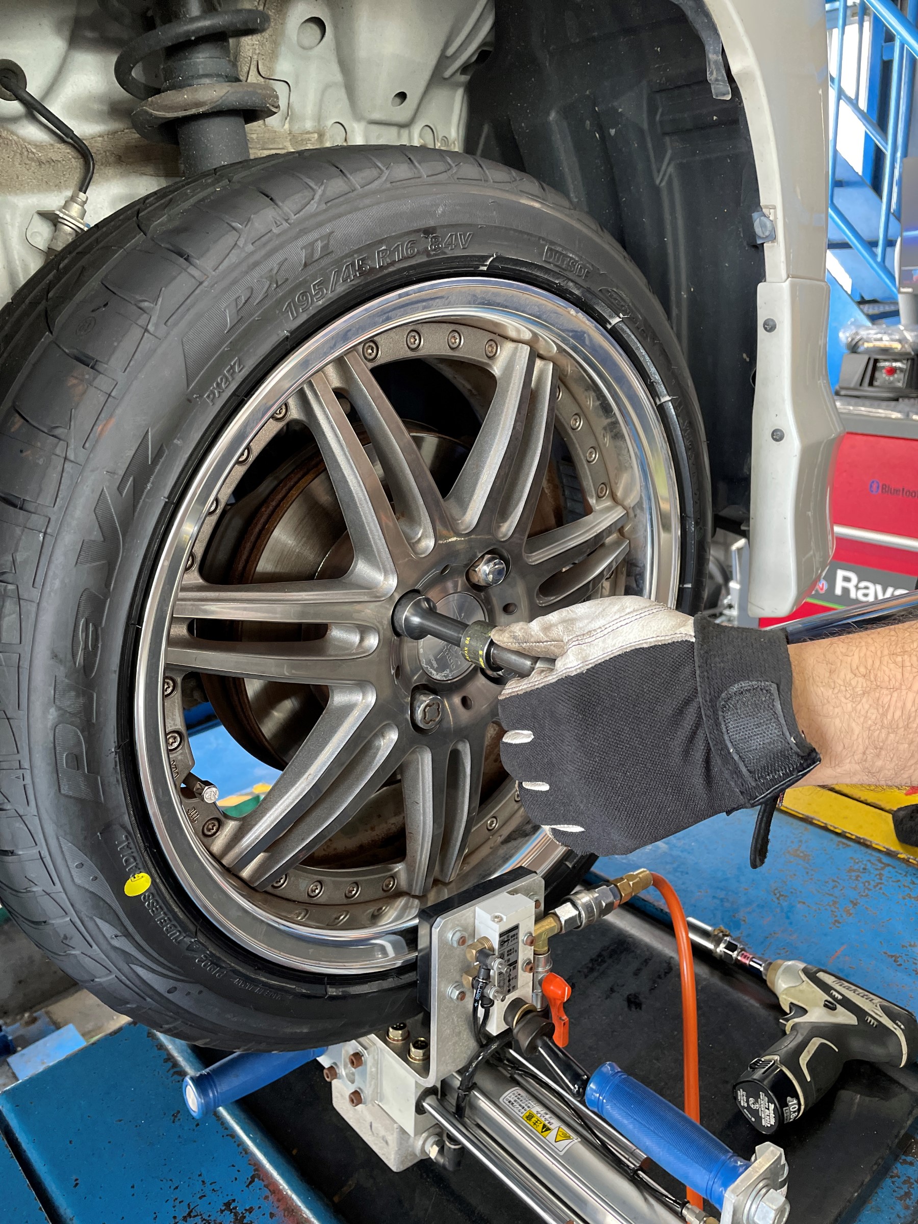 タイヤの組み込みが終わると、ホイールバランス調整を行い取り付けです。