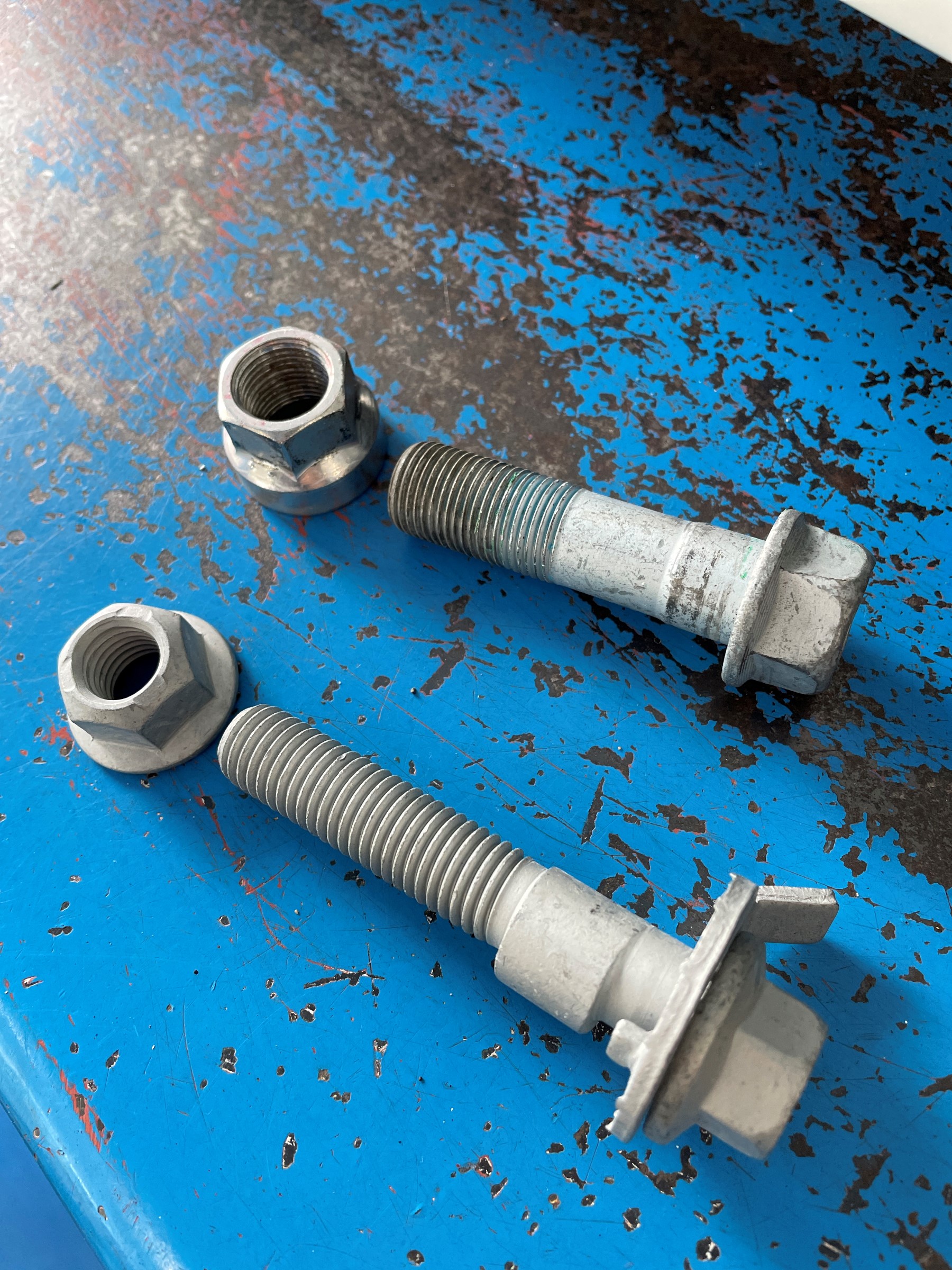 純正ボルトと比べると、手前のキャンバーボルトは偏心カムになっているのがわかります。
