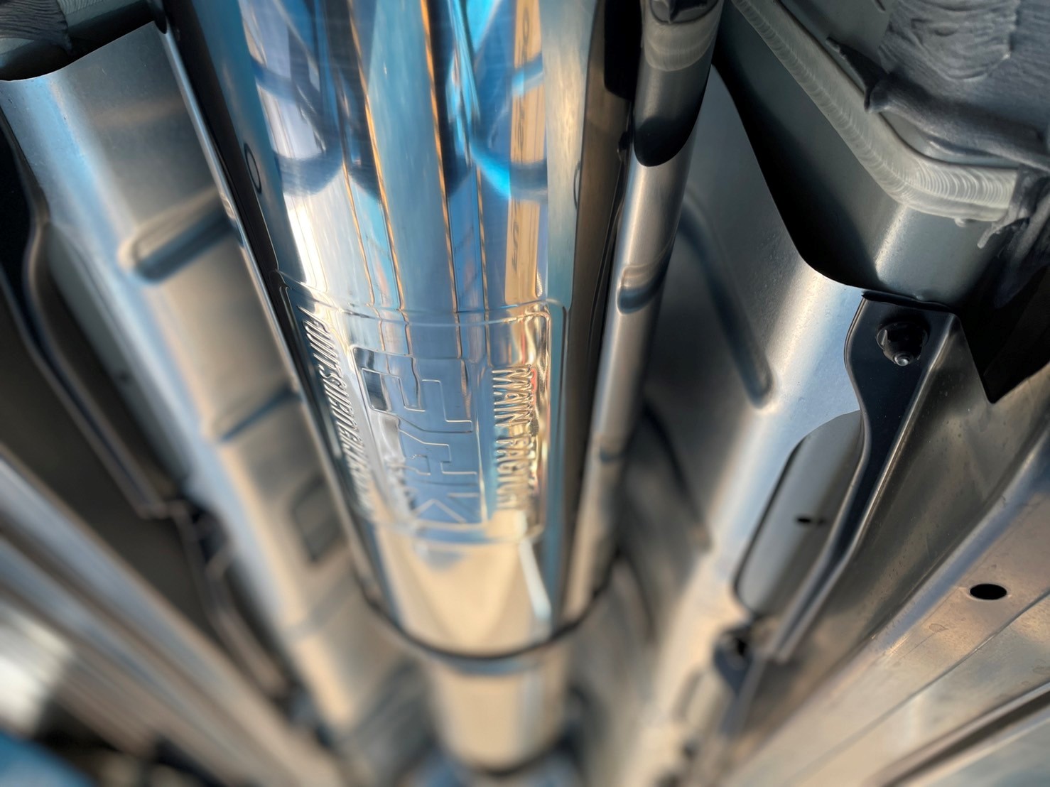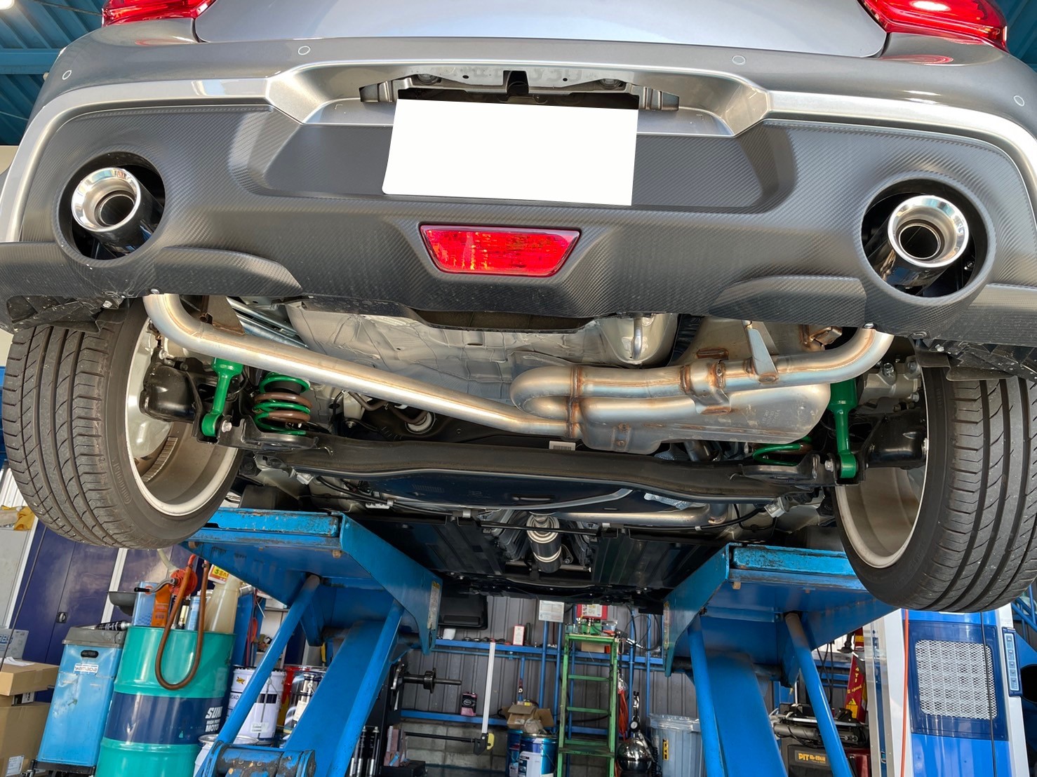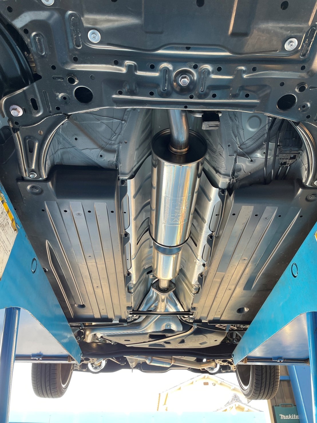 まずは大きなタイコが付いている純正のマフラーを外していきます!!中間パイプも取り外しているのでかなりすっきりしています(笑)