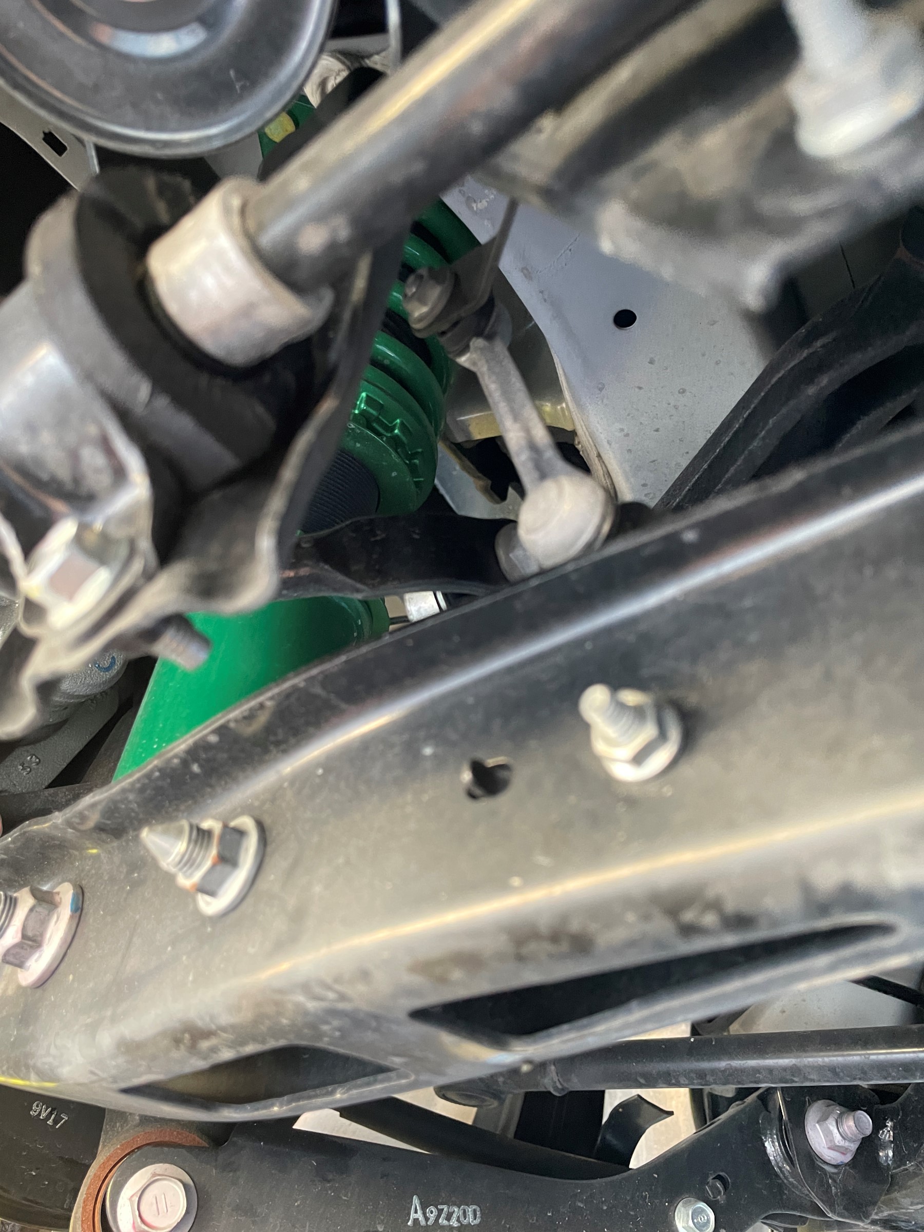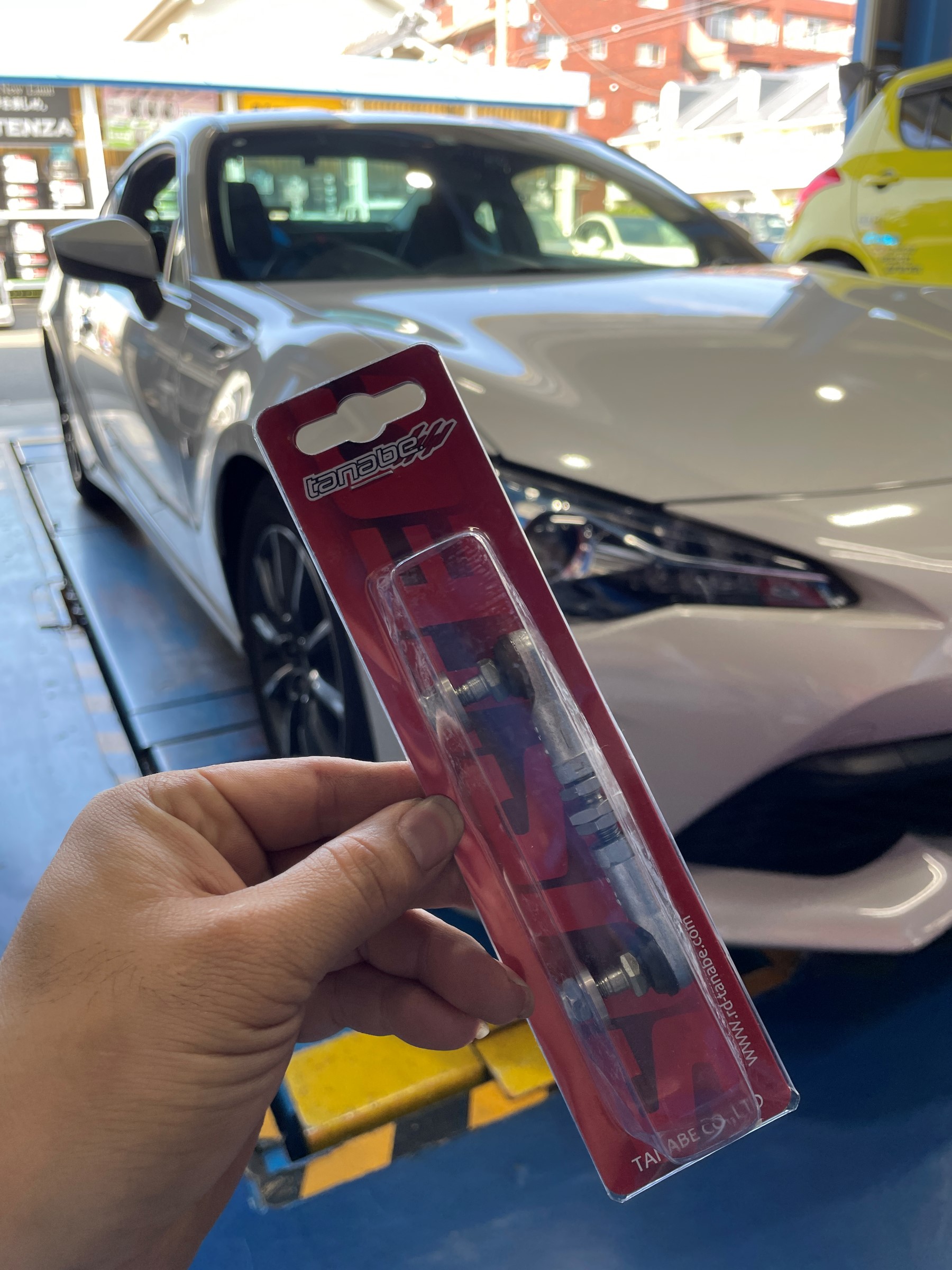 タイヤが組みあがると、いよいよクルマに取り付けます。その前に、車高調を装着したためヘッドライトの光軸が下がってしまっているので、『TANABE』の調整式のセルフレベライザーアジャストロッドに交換します。