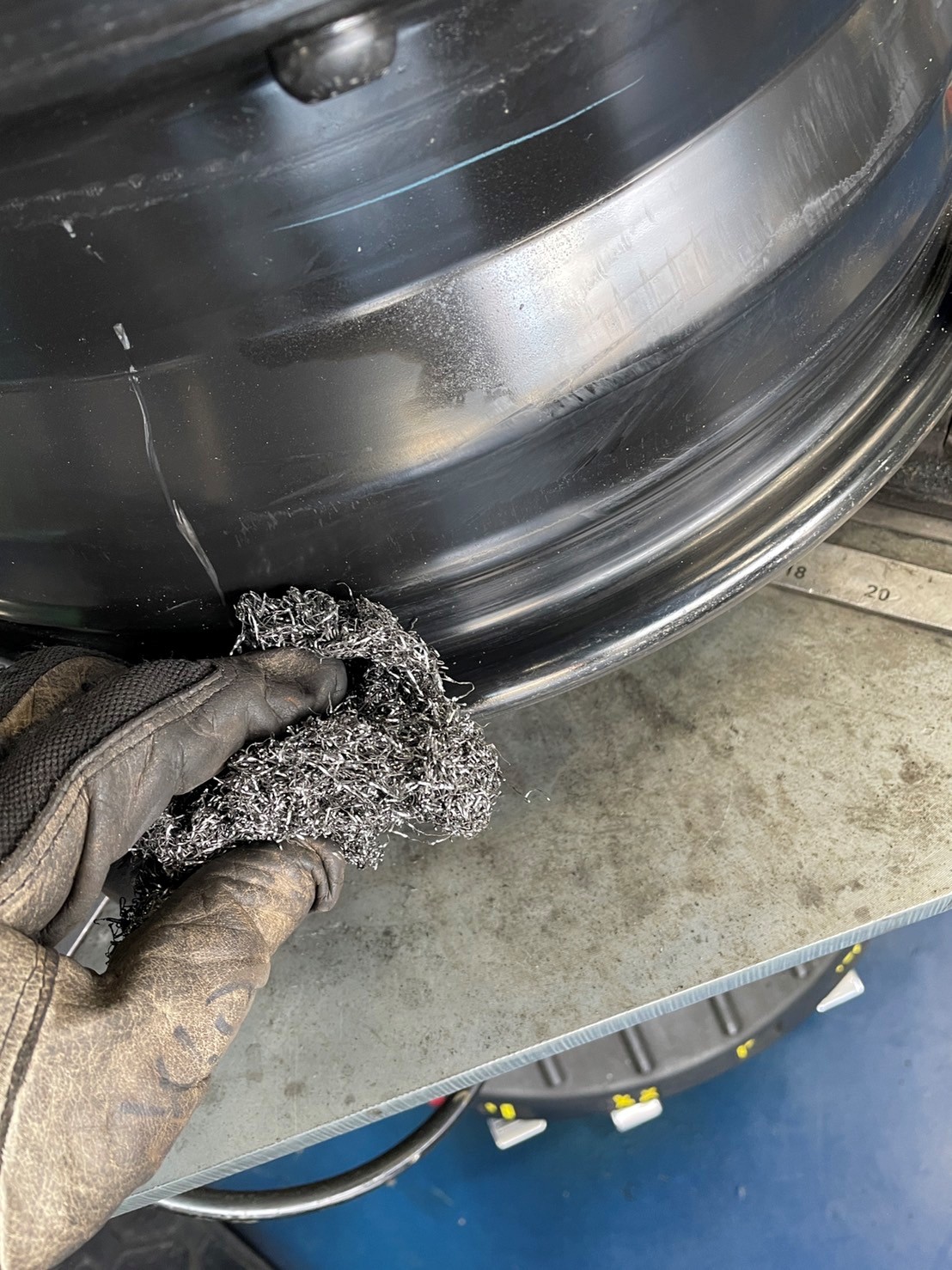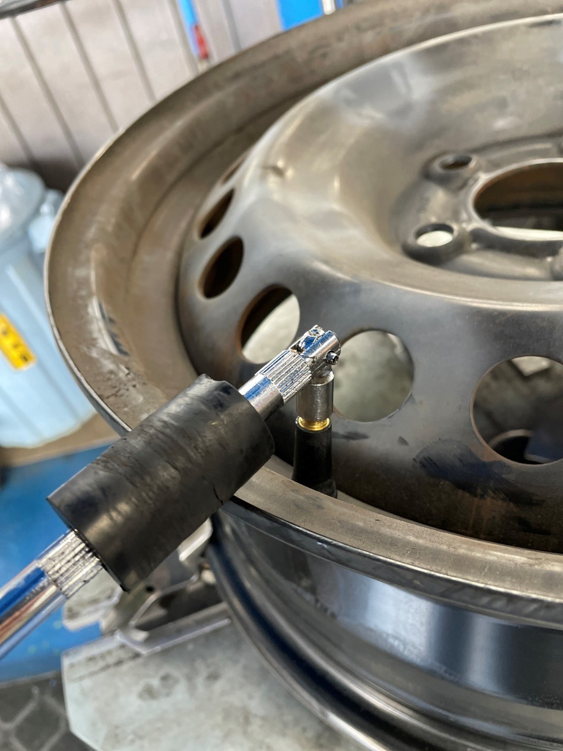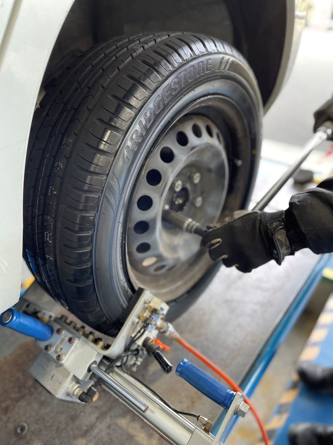 充填が終わると最後にホイールバランサーと呼ばれる機械でホイールのバランスを測定し、それに合ったウェイトを打ち込みます!!