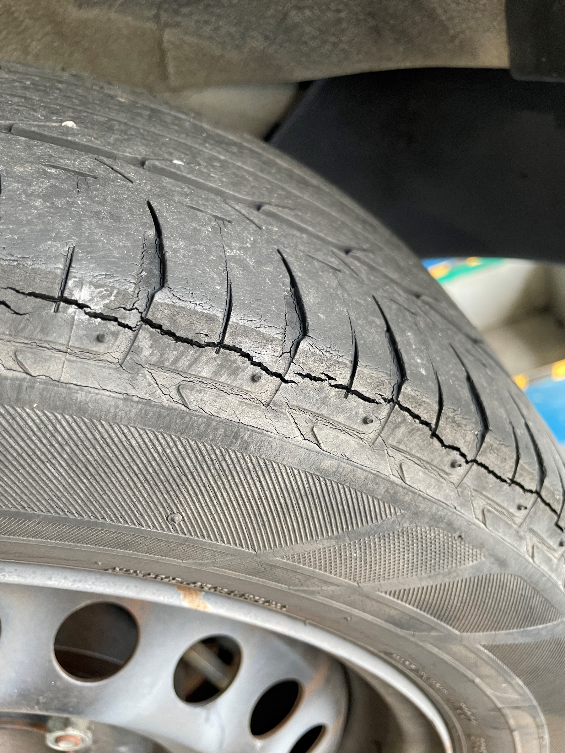 溝はまだあるのですが経年劣化でタイヤ側面に深い亀裂が見られます!生産年を確認すると
