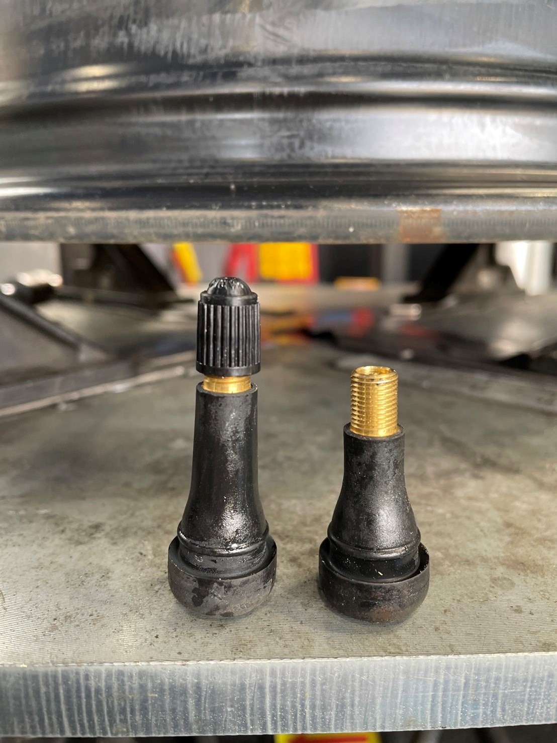 まずはタイヤを取り外し、ホイールをキレイに清掃します。下の写真はエアバルブで、左がこれまで装着していたバルブです。日産車に多いのですが少し長いのが使用されています。
