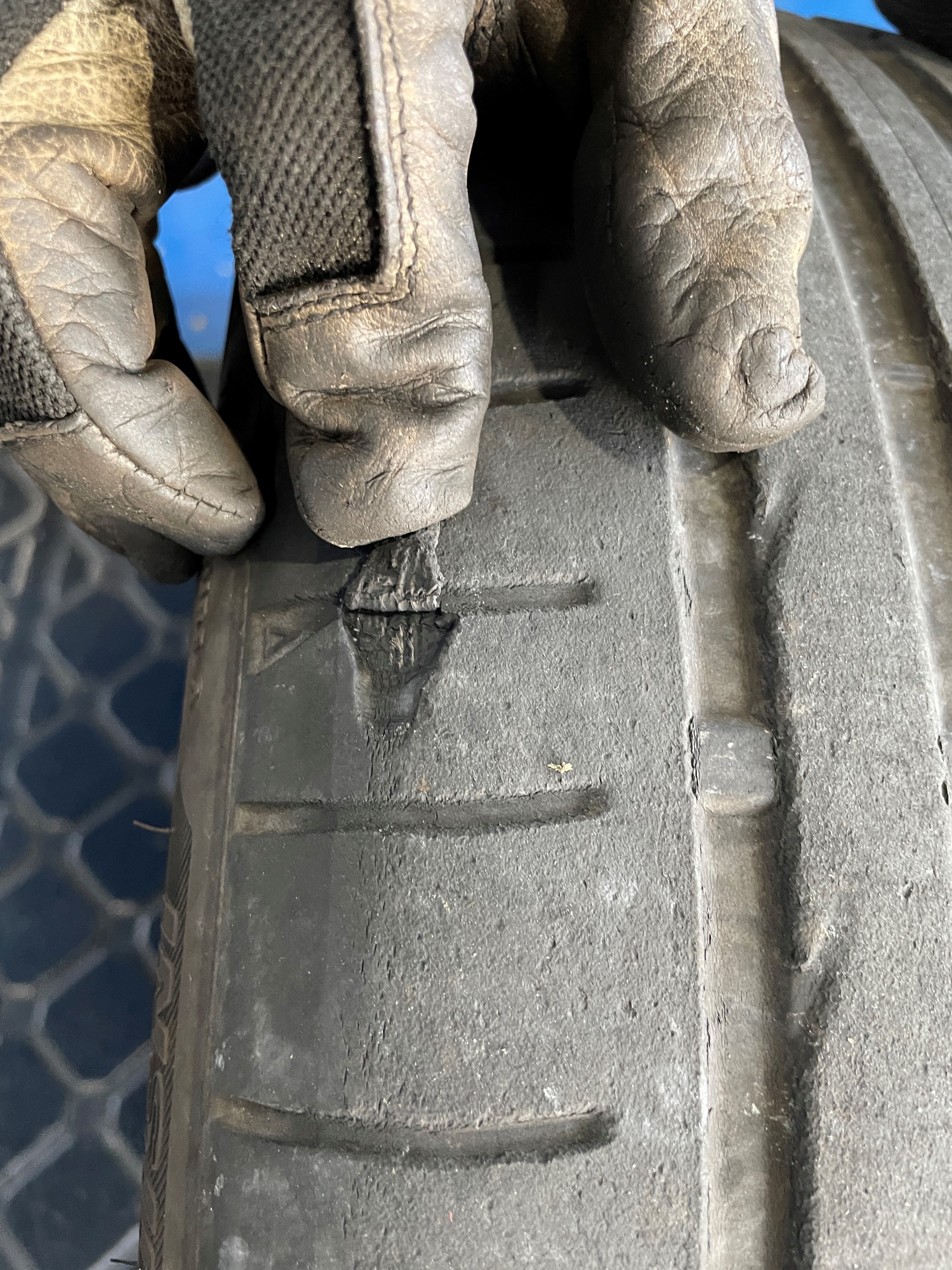 前のタイヤが左右とも外側だけるつるつるに!?ワイヤーが飛び出る一歩手前まで溝がなくなってます!!