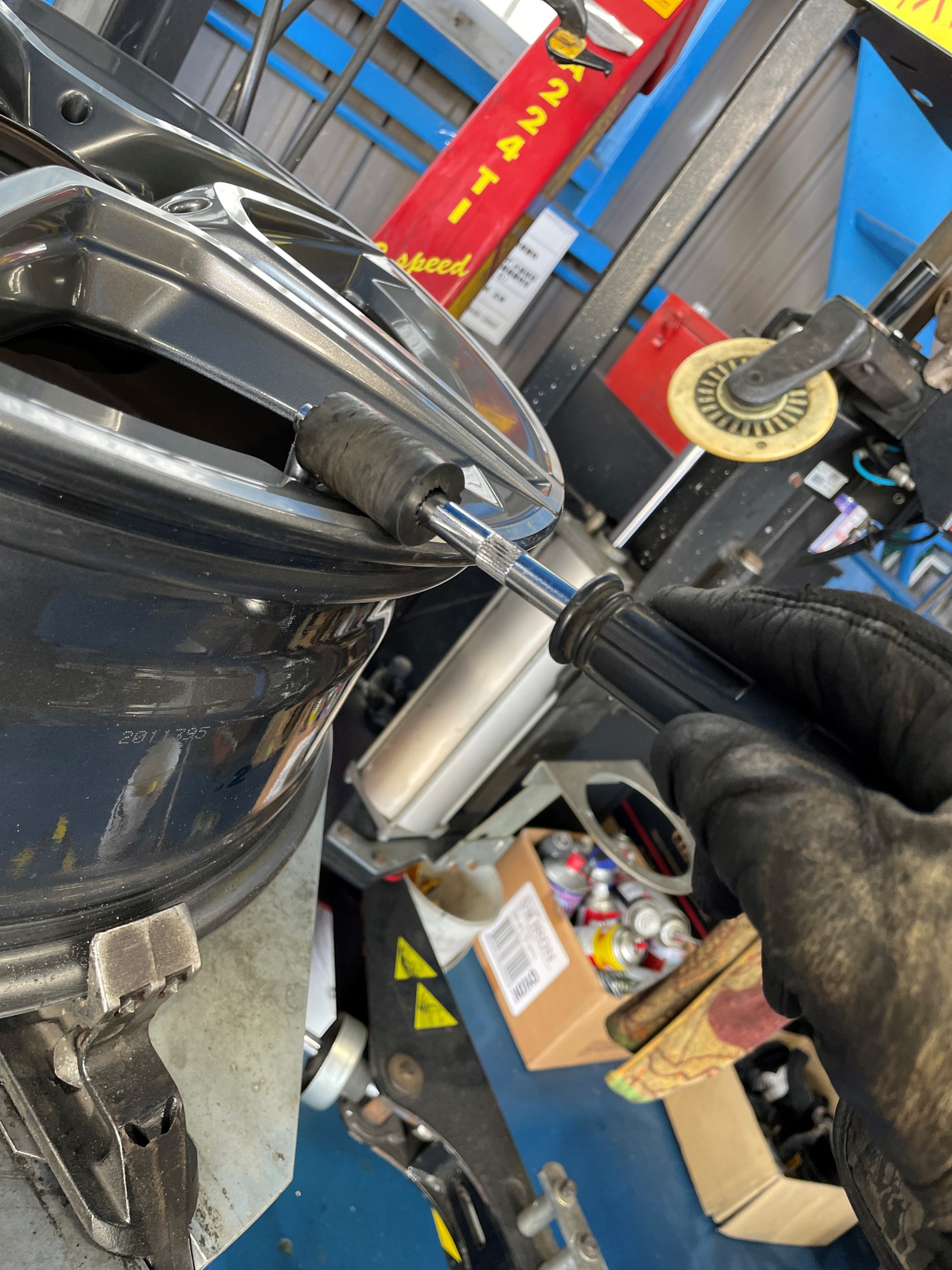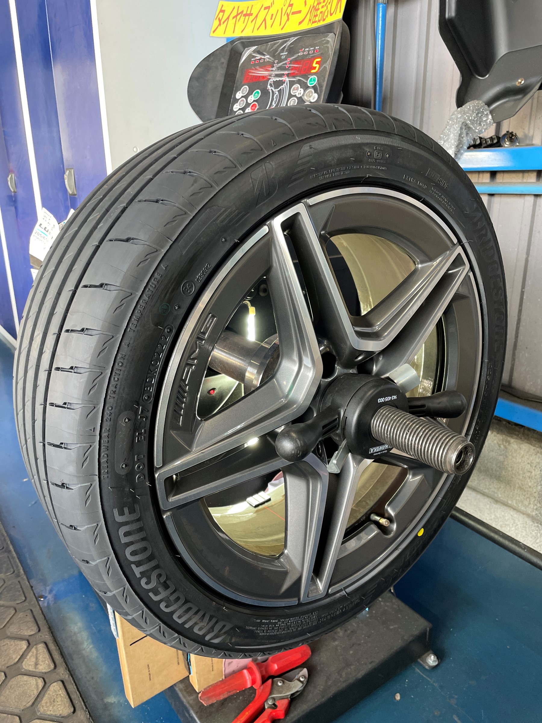 最後にホイールのバランサーでバランスを測定し、それに合ったウェイトを貼り付けて作業完了です。