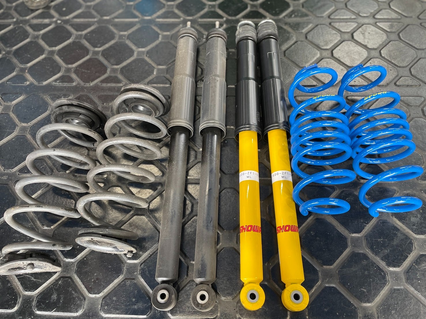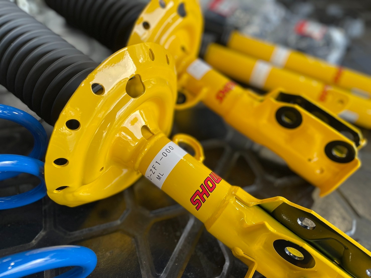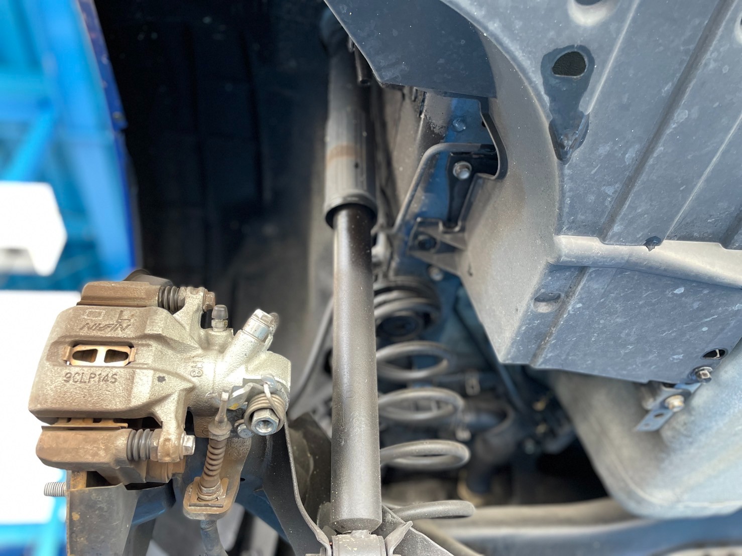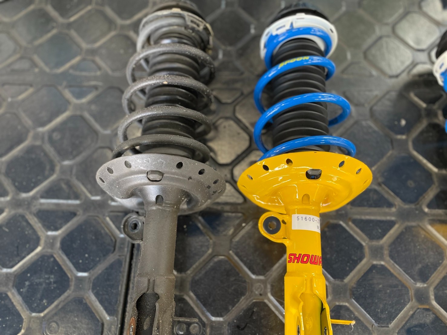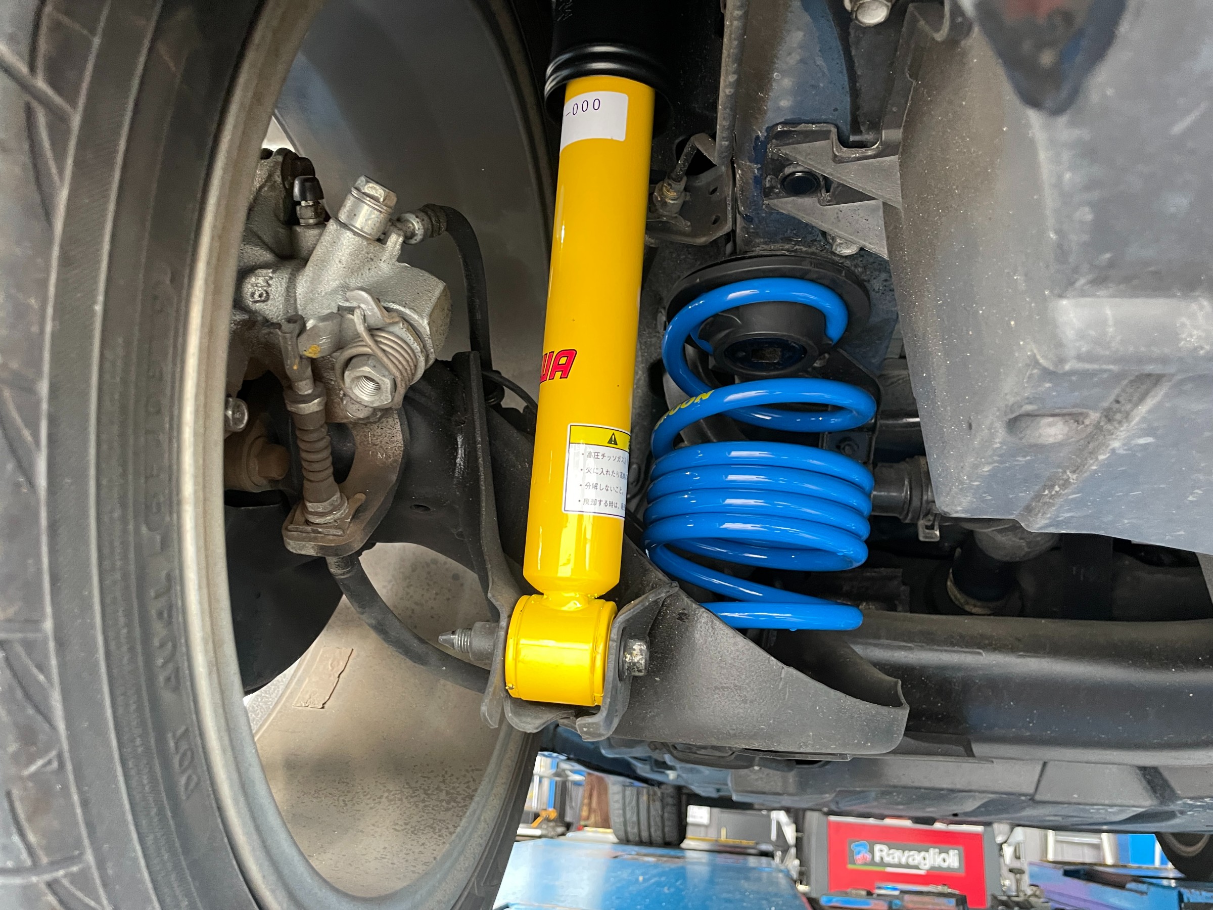 えっと、ノーマルの足回りの写真は・・・当店のブログをよくご覧になる方はお気づきかもしれませんが、あっという間にテンチョーが取り外して、写真が撮れませんでした。