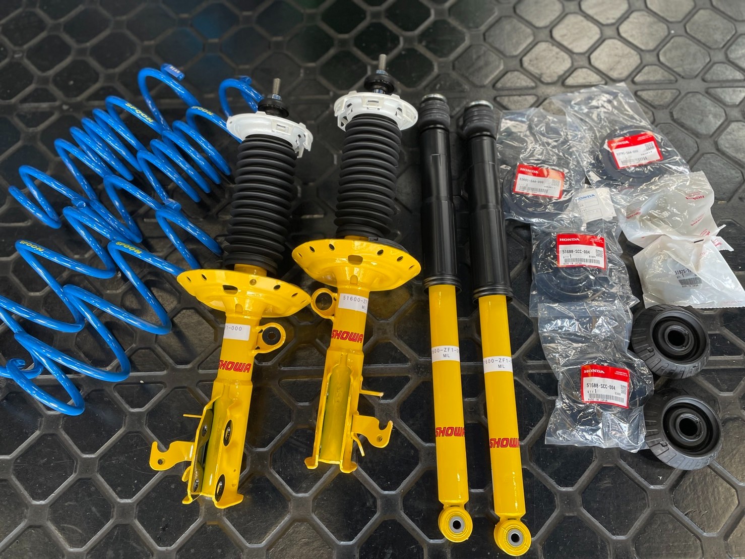 今回はそんなCR-Zの足回りをリフレッシュしてくのですが、こちらのおクルマはお仕事でも使用されるとのことで、あまりローダウンができないそう。そこでサスキットを取り付けることになりましたが、ホンダの足回りといえば『スプーンスポーツ』さん。『ダンパーキット&プログレッシブスプリング』をチョイスしました!