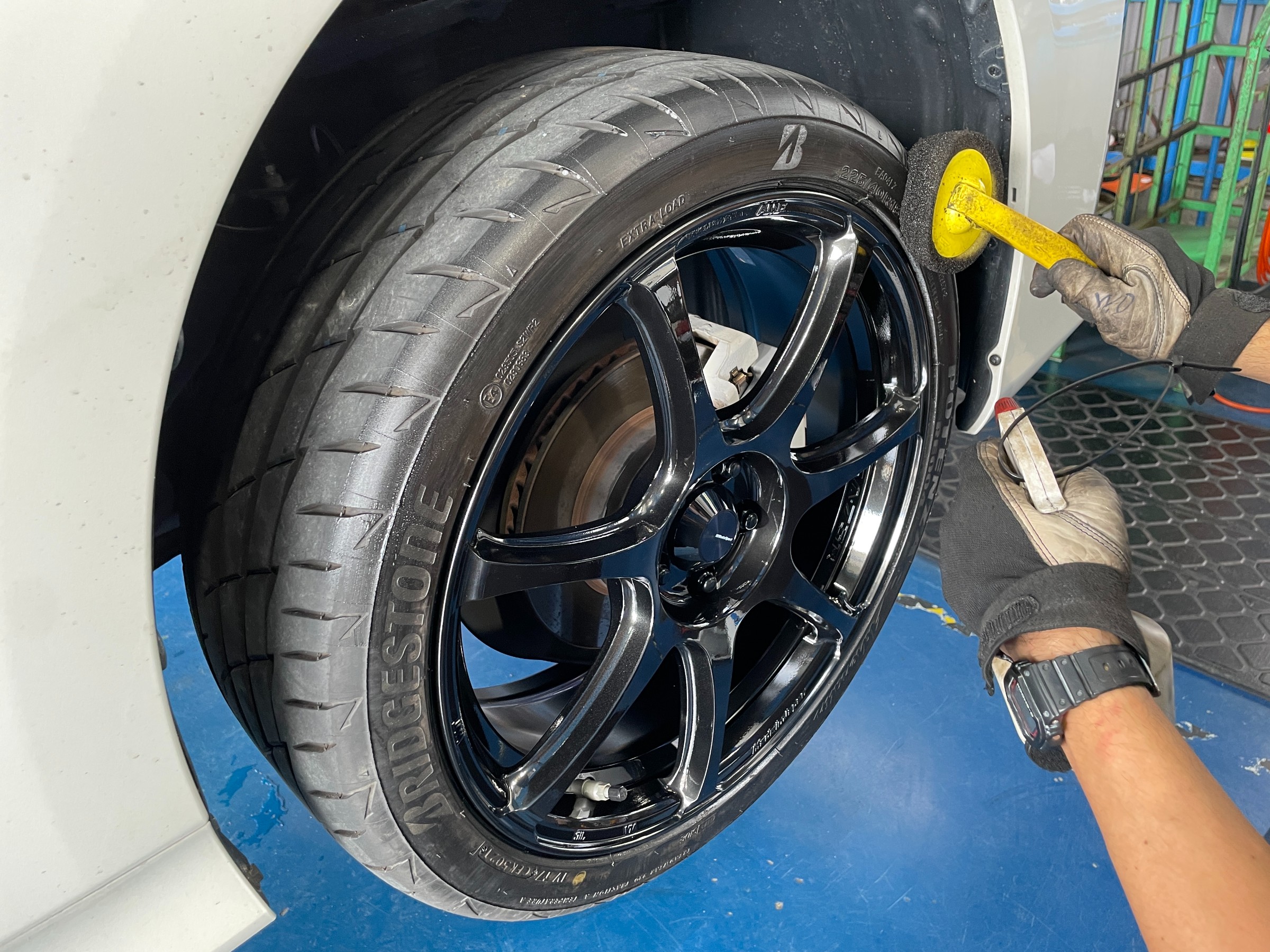 取り付け後に丁寧にタイヤワックスを塗りこんでいきます!!本来でしたらここで作業終了ですが、今回は同時に『アライメント』も測定・調整していきます!!ホイールを当ててしまってますし、せっかくの新品タイヤですので長くご使用いただきたいので、しっかり調整していきます!!
