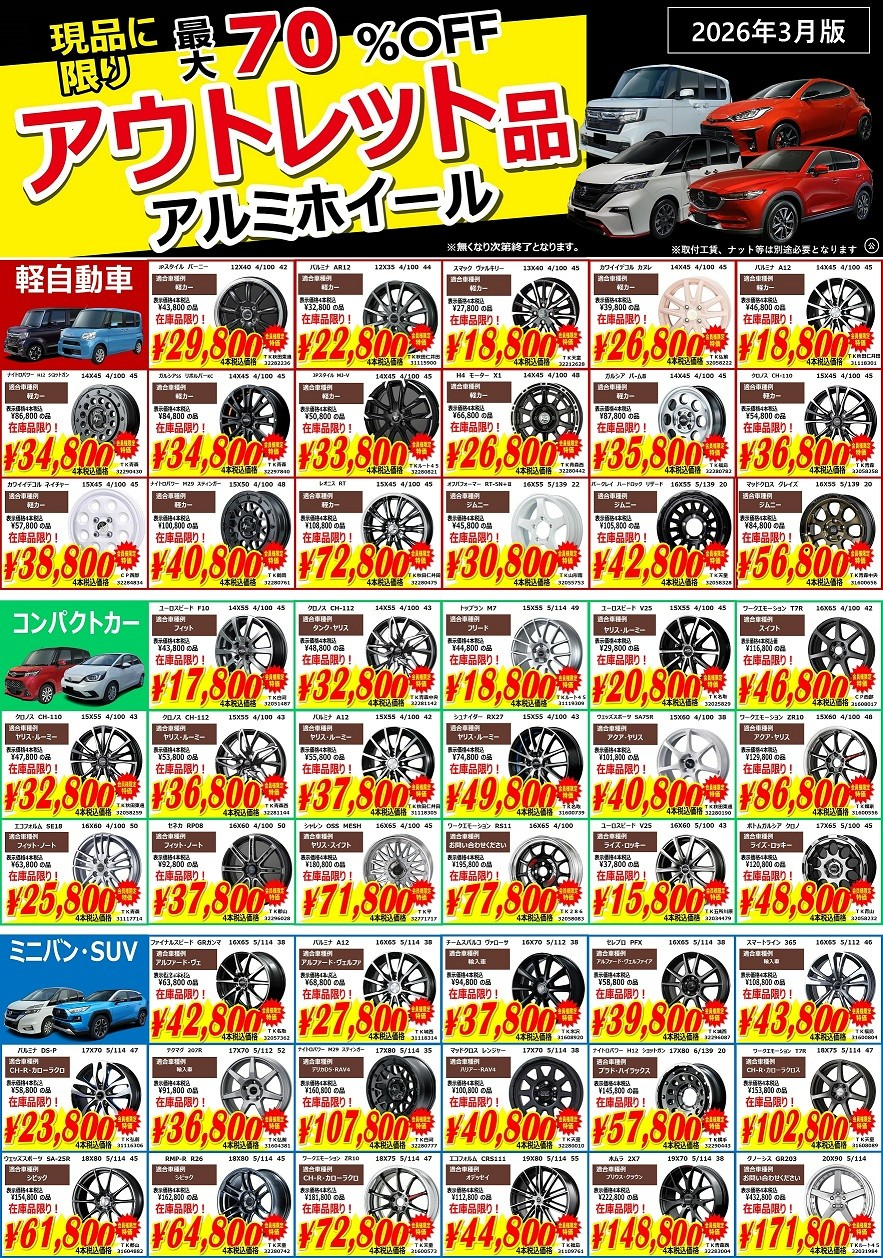 2026年3月14日~2026年4月4日 最大70%オフ!【3月最新】アウトレットアルミホイール【現品限り】