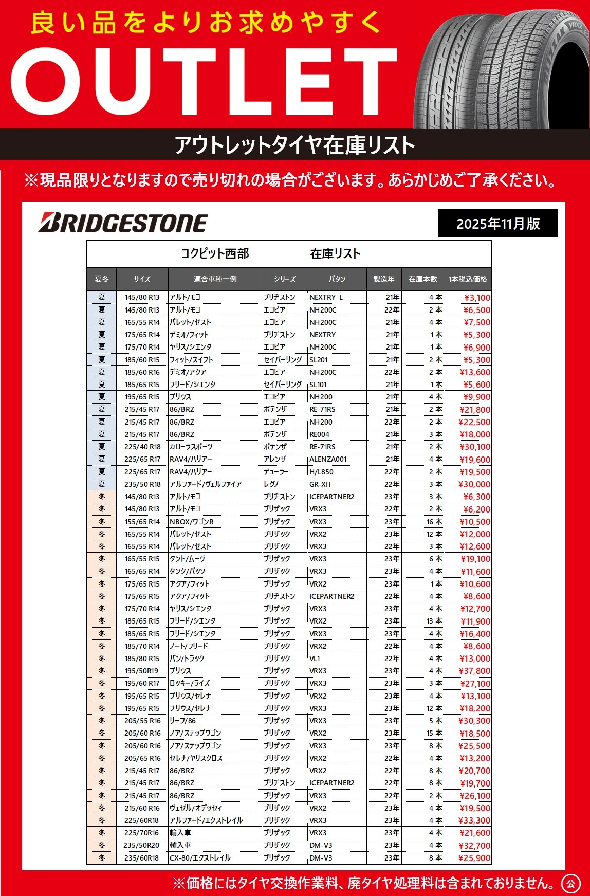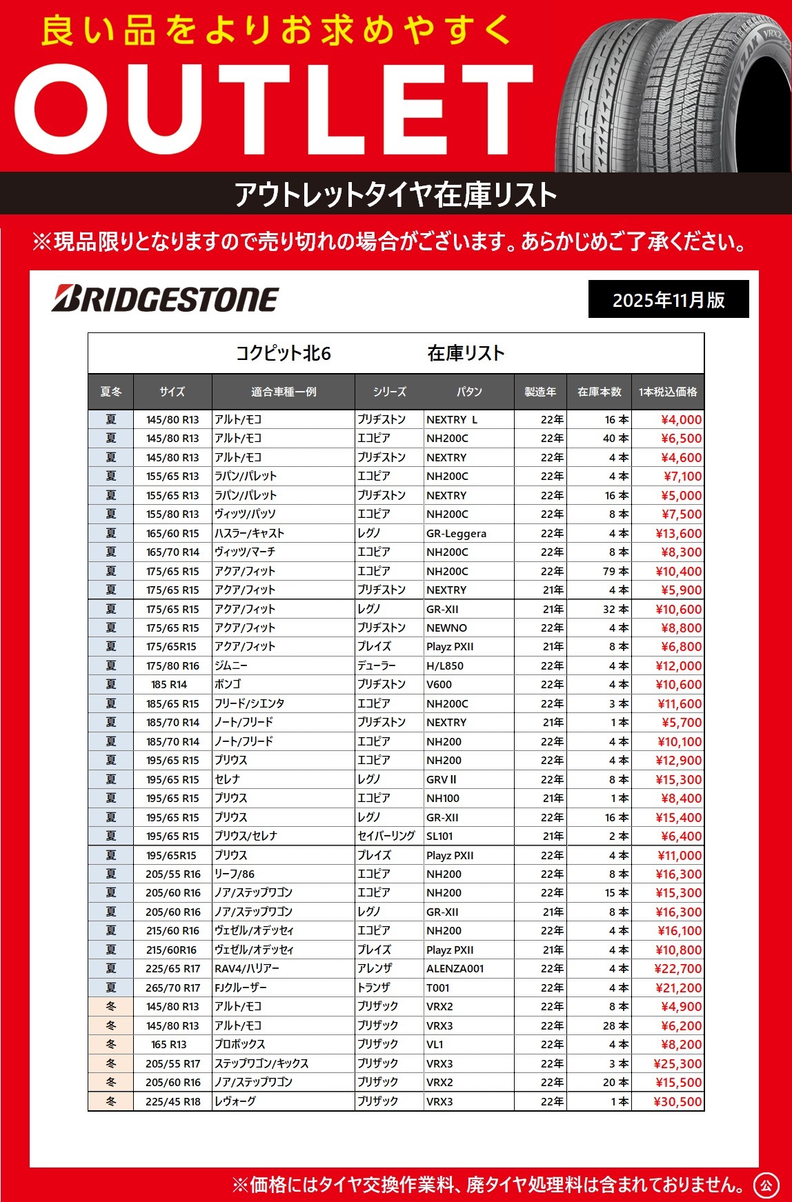 2025年11月7日~2025年12月7日 【お買い得】アウトレットタイヤ在庫一掃