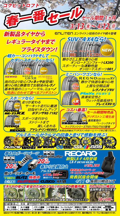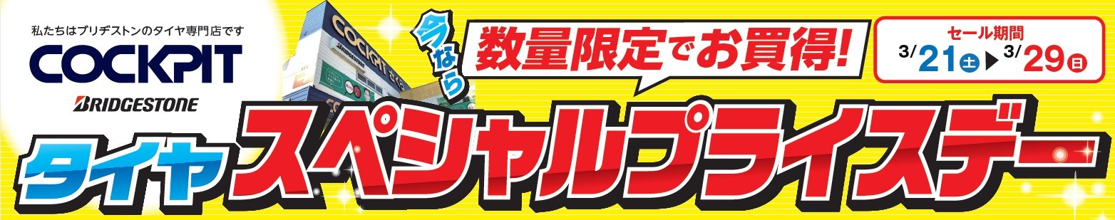 タイヤスペシャルプライスデーは、3/20(金)~3/29(日)まで。