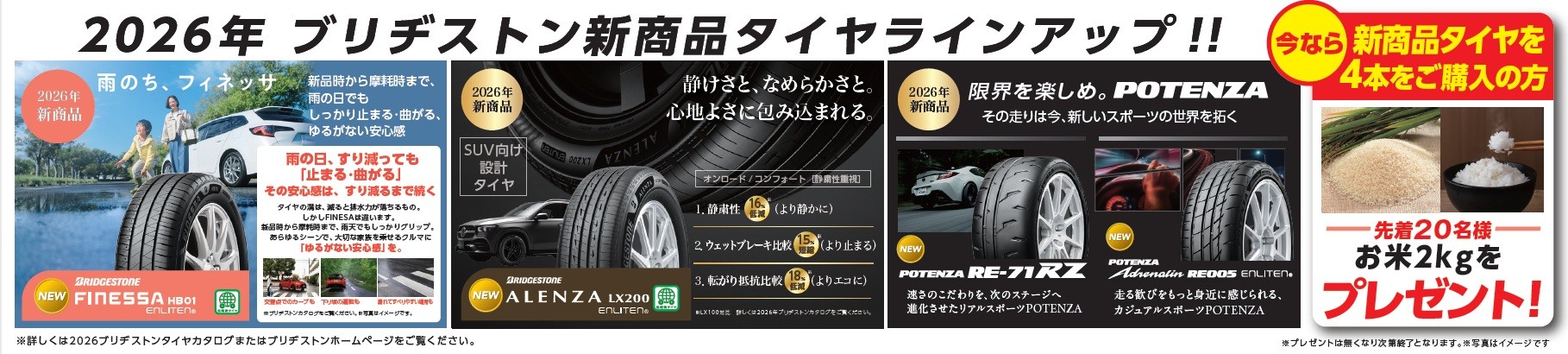 期間中は新商品の夏タイヤ4本ご購入の方へお米2kgを先着20名の方へプレゼント!